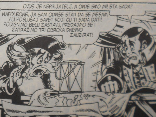 Parodijsko-groteskni pristup čak ide dotle da se npr. kao uzrok Trojanskog rata navodi tvrdnja da je prelepa Helena zapravo bila izuzetno rastrošna, pa je čak Menelaj udesio neke olakšice da je Paris „otme“, a kad se i u Troji pokazala kakva je, Spartanci nikako nidu hteli da je, na zahtev ogorčenog Prijama, prihvate da se vrati!! Ili Napoleon Bonaparta u neprilici, koji sa našim pripovedačem razmatra varijantu da se predaju neprijatelju (Austrijancima) da bi dobili zagarantovani obrok…