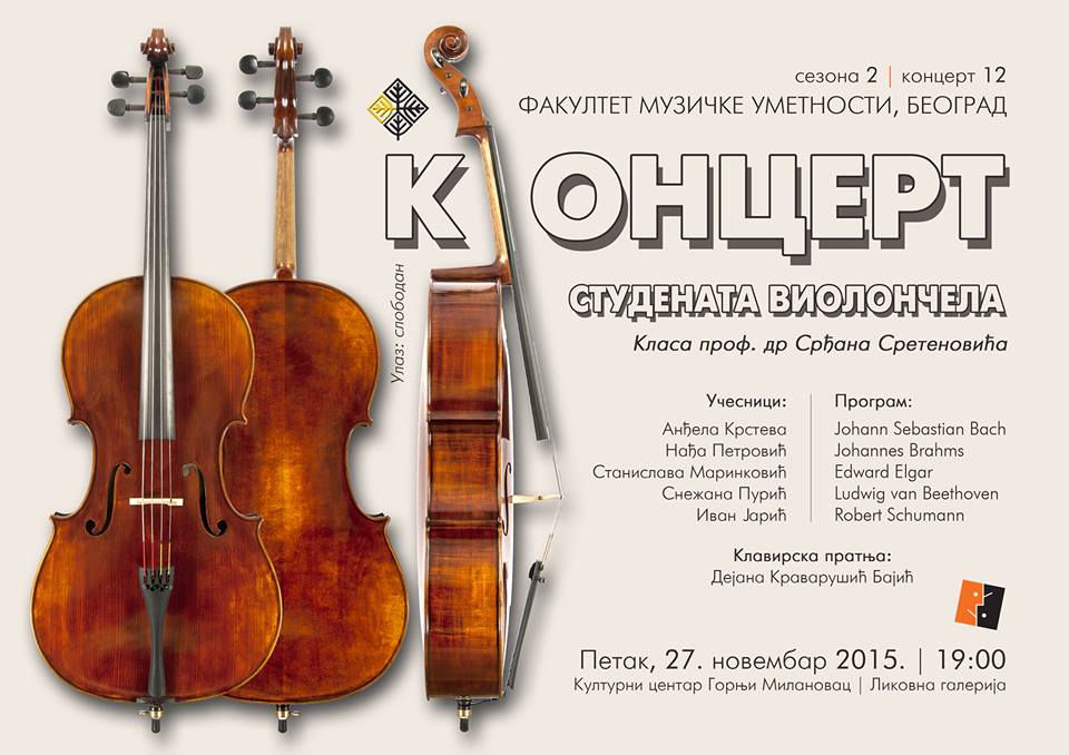 Kulturni centar Gornji Milanovac, u petak, 27. novembra u Likovnoj galeriji organizuje koncert studenata violončeča Fakulteta muzičke umetnosti u Beogradu: Anđele Krsteve, Nađe Petrović, Stanislave Marinković, Snežane Purić i Ivana Jarića uz klavirsku pratnju Dejane Kravarušić Bajić.