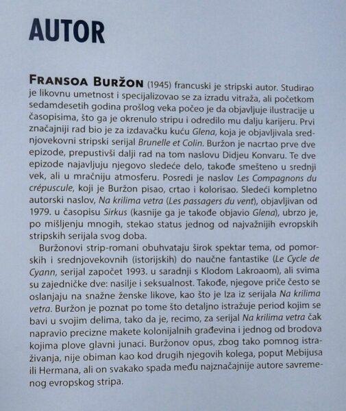 Dakle, bez namere da mnogo detaljno zalazimo u priključenija junaka, reći ćemo da je reči od jednom od upečatljivijih ostvarenja francuskog stripa na prelazu iz 1970-ih u ‚80-e (tj. prvih pet poglavlja, sa znatno kasnije urađenim nastavcima) Reč je o ostvarenju Na krilima vetra, francuskog umetnika Fransoa Buržona (Bourgeon) – lepo prevedeno sa originalnog “Les Passagers du vent”, što bi preciznije bilo Putnici na vetru, a videćemo malo kasnije kakvi ih sve tokovi nosaju…