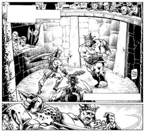 Druga stvar koju Jovčevski nudi u „Čuvarima“ je otvorena ljubav prema Konanu, ali ne toliko Hauardovom koliko filmskom, onom istom gde je Švarceneger u sitne gaće tamanio narod i udarao kamile. Kah-Tal se od Konana razlikuje samo po tome što je otac i barem malo veseliji i opušteniji. Inače je takođe ogaćeni mišićavac koji vitla oružjem tek da pokaže kako lako glave mogu da padnu. Naravno, ima tu još spona ka filmskom Konanu (pomenuti azijski strelac, na primer), i nisu tu smeštene džabe. Jovčevski je ljubitelj ne samo Konana, već mača i magije generalno. Ne postoji kadar ovog stripa koji ne odiše energijom Hauardove fantastike, od prvog kadra sa strmom planinom do poslednjeg gde Kah-Tal drži sina u rukama. Jovčevski ovim albumom kaže „jeste, volim ovakvu fantastiku, i ovaj album je dokaz moje ljubavi koju evo ovde delim sa vama“.