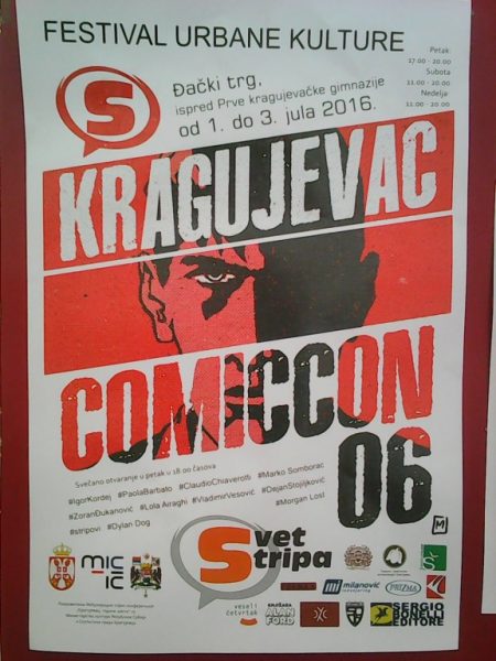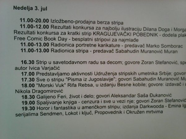 noviji ili reciklirani prodajni materijal raznih izdavača, a prema najavi nije oskudevao u raznim prezentacionim i kontakt sadržajima (tribine, predavanja…) pri čemu se može istaći npr. gostovanje velikog Igora Kordeja, i jednog autora scenarija o Dilanu Dogu, šarmantne Paole Barbato! Sve to, opet, sad ne bismo mogli ubedljivije da posvedočimo, niti bismo ikome i ičemu posebno pravili reklamu, ali neka se vidi šta su Kragujevčani i drugi šetači mogli sebi priuštiti na Đačkom trgu.
