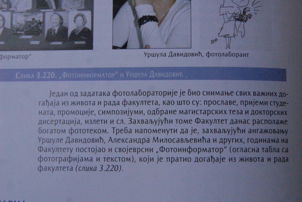 „На Машинском факултету фотографијом сам пратила све важније догађаје, али и на Унивезитету и осталим факултетима. Свакодневно сам у холу факултета имала изложбе текућих догађаја, одбране доктората… Тридесет пет година за редом сам за дан Факултета правила изложбене паное „ФОТОИНФОРМАТОР”. Моје фотографије су биле основ Архиве Универзитета, за књигу „Споменица Универзитета у Крагујевцу 1976 – 2006” и чувају се у Библиотеци. Велика је туга што је нестала Књига утисака са тих изложби.