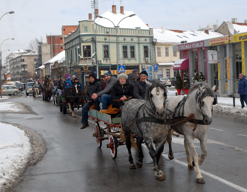-Окупљање испред Сајмишта почело је честитања празника и загревање шумадијским чајем Тачно у 12 часова поворка од шест двопрега и једног једнопрега упутила се најављеном маршутом ка „Крсту“ у пешачкој зони и Главном улицом поред Клиничког центра вратила се назад.