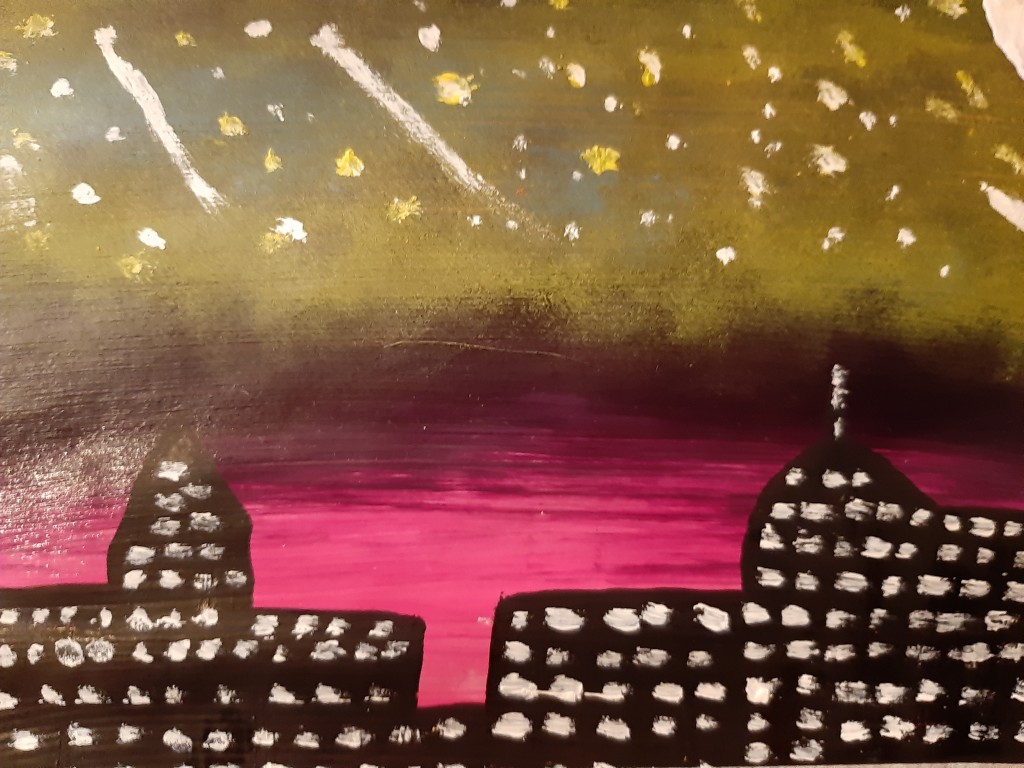 Светла солитера, горе високо светлуцају као свици, као прхнуло јато птица на небу. Иза сваког тог светлуцавог квадрата људи и њихове судбине, живот у свим својим облицима и туга, и мржња, љубав, страх, усамљеност…