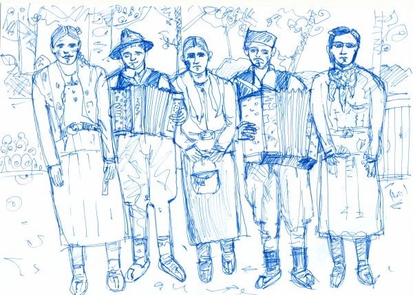 ВАШАРСКИ МУЗИЧАРИ “Прва половина двадесетог века. Скица на папиру урађена према пожутелој фотографији на зиду старе напуштене куће Планића,село Претоке, општина Кнић, округ Шумадински“