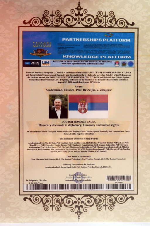 Ја не патим од титула и звања, стигло је признање ЦИЦЈ – а где сам званично признат за „Почасног Доктора дипломатије, хуманизма и хуманитарног права. Пријатно изненађење. Неко прати гледа и цени ко шта ради! Опет кажем, то је титула ко је ја делим са својим сарадницима и са свим људима којима је Србија на души, скромно је прокоментарисао ново признање академик проф Др. Жељко В. Зиројевић.