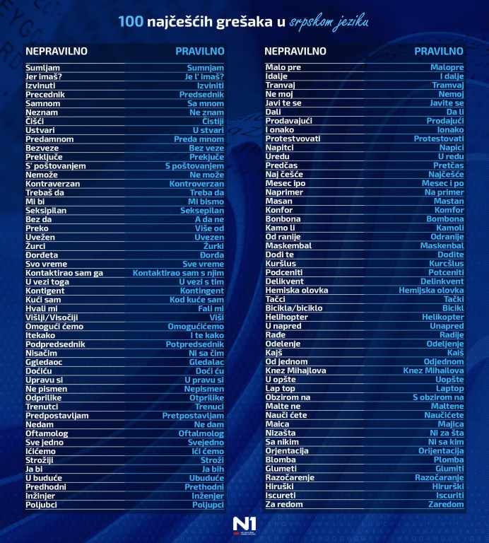 U nastavku teksta možete pogledati listu od stotinu najčešćih grešaka u srpskom jeziku, koje smo iz „bogate ponude“ izdvojili uz pomoć profesorke Marine Nikolić sa Instituta za srpski jezik Srpske akademije nauka i umetnosti (SANU).