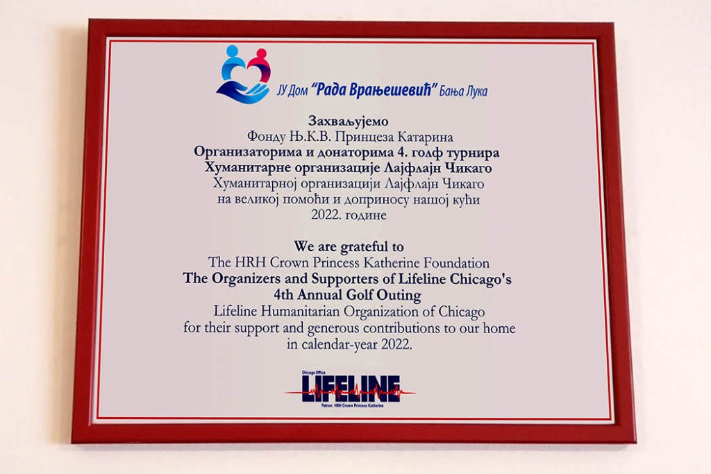 „Želimo da izrazimo zahvalnost dugogodišnjim prijateljima našeg velike kuće – Fondaciji NJ.К.V. Princeze Кatarine, donatorima četvrtog humanitarnog Golf turnira i Humanitarnoj organizaciji Lajflajn iz Čikaga, povodom realizovane druge faze projekta – opremanja i renoviranja prizemlja objekta – vaspitne grupe – vrtićka porodica u našem Domu. Realizacijom navedenog projekta je znatno unaprijeđen standard boravka naših najmlađih štićenika. Djeca su se veoma obradovala novom prostoru za boravak i igru, a radost i osmjeh na njihovim licima, za nas je neprocjenljiv.