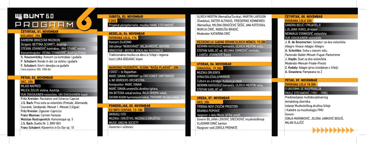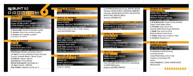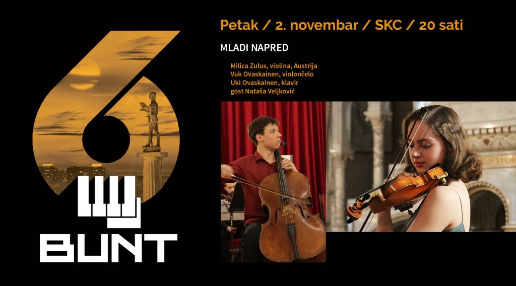 Vuk Ovaskainen, Milica Zulus, Una Stanić i Stevan Jovanović, vrhunski mladi umetnici najmlađe generacije, dobili su značajan prostor na koncertima BUNT-a. Bilja Krstić i ansambl Bistrik pokazuju kako se umetnički radi sa decom i mladima sa posebnim potrebama. Na okruglom stolu, gostima iz inostranstva pridružuju se i domaći stručnjaci. Oni, kao nikad do sada, na BUNT-u raspravljaju o mestu muzike i kulture u savremenom društvu. Predstavljamo novo izdanje Muzikološkog društva Srbije.