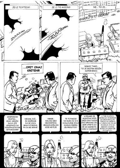 Čemu sad ovo naklapanje? Pa, studentska kreativnost neretko – ili možda prečesto – upravo ovako odamre, brzo i situirano u jedan period. Naravno, isplivaju slučajevi kada ta kreativnost ode dalje, a otišla je dalje sa ovim ovde junakom o kome će u tekstu biti reči. Na svojim studijama, u Nišu nebitno koje godine (ili Naisburgu, ako ćemo terminologijom stripa) persone imenima Homer Karabeg, Andrija Tam Tam i Deksa Pantelejski su u trenucima konzumacije alkohola i loše studentske kahve kreirali prvog južnomoravskog – da južnomoravskiji ne može da bude, ako smem da dodam – superjunaka, i nazvali ga Extra Gedža. Taj isti gorepomenuti Deksa, koji se sada u krugovima čitalaca beletristike provlači kao autor „Konstantinovog raskršća“ i „Dugih noći i crnih zastava“ imenom Dejan Stojiljković, je kasnije naleteo na Peđu Slavnog, odnosno Predraga Ikonića, crtača iz Republike Srpske, i rešio da vaskrsne lik i delo Extra Gedže u stripovske okvire. E sad, možda ima i rupa u ovoj priči, nekih događaja koje sam zaboravio ili neadekvatno prikazao, ali oprostićete jednom svežem ex-studentu, i on je sklon alkoholu ipak. Elem (melem), album „Extra Gedža: Tatko na superheroji“ jeste kompilacija epizoda nastalih iz pera Predraga Ikonića, sa glavninom dijaloga i scenarija Stojiljkovića i gorepomenutih ortaka. Album je pušten u javnost 2008. godine, u sitnom tiražu, i verovatno je jedini u tom periodu koji se rasprodao skroz-naskroz. Koncepcija albuma je pojam za sebe: pored četiri strip epizode varirajućih broja tabli, strip sadrži i skice radnog procesa crtača, ilustracije nekih eminentnijih imena srpskog stripa, propratne tekstove, novinske isečke i intervjue (svi naravno istog karaktera kao i sami stripovi), tzv. južnomoravski rečnik, alternativne naslovne strane i blurbove, koji su opet istog karaktera kao i sam strip.