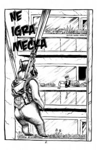 Favorit drugog reda mi je bio Admir Delić, ali nevezano za samu zbirku. I znam, verovatno će me ljudi popreko gledati zbog ovoga, s obzirom da je Delić autor par stripova vezanih za Srebrenicu, ali odmah da naglasim, neću o toj temi diskutovati ovde jer nije ni vreme, ni mesto. Ne, meni je Delić ostao u lepom sećanju kao autor prvog bosanskog nindže, zvanog „Minja“ (čitaj: mindža; objašnjenje bespotrebno). Ovo je prvi onlajn strip na prostorima ex-juge, barem koliko ja znam, da je dobio svoj mix-tape, i to od strane nekih eminentnih BiH repera. Delić je iznenađujuće aktivan strip autor, s obzirom na to da je relativni novajlija na ovom polju, i kakvi god mu bili politički stavovi (makar se kosili i sa mojim), voleo bih da vidim na koji način će se dalje usavršavati.