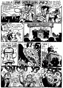 Zrenjaninci se vraćaju, a svako ko me zna dobro je upućen koliko zdušno o Zrenjanincima pišem. Od ovog autorskog dvojca, Kuzmanov je taj koji je odneo treću nagradu (ali s razlogom; u sklopu stripa „Fasces“, Živanov je samo unosio slova) svojom pričom od jedne table o fašizmu. Korišćenje Jug Bogdana, devet Jugovića i kneza Lazara kao alegoriju na aktuelne desničarske elemente je očekivano (to je, naposletku, bila omiljena alatljika onovremenog levo-orijentisanog aktiviste), međutim ovde funkcioniše izuzetno; poznati element iz narodne priče je izopačen, otprilike koliko su desno-orijentisani mongoloidi onog doba znali da izvrnu istoriju i tradiciju u svoju korist.