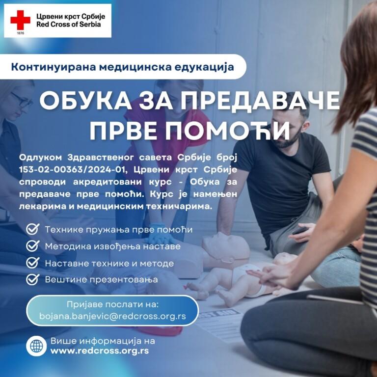 Crveni krst Srbije sprovodi akreditovani kurs za predavače prve pomoći. Kurs je namenjen lekarima i medicinskim tehničarima.