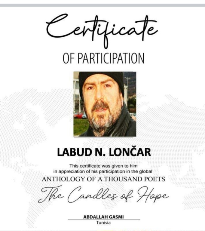 U izdanju od Abdalah Gasmia, iz Tunisa, objavljena je Svetska antologija hiljadu pesnika“Sveće nade” (The Candlles Of Hope) u kojoj je zastupljeno hiljadu pjesnika iz čitavog svijeta a iz dvesta dvadeset zemalja.