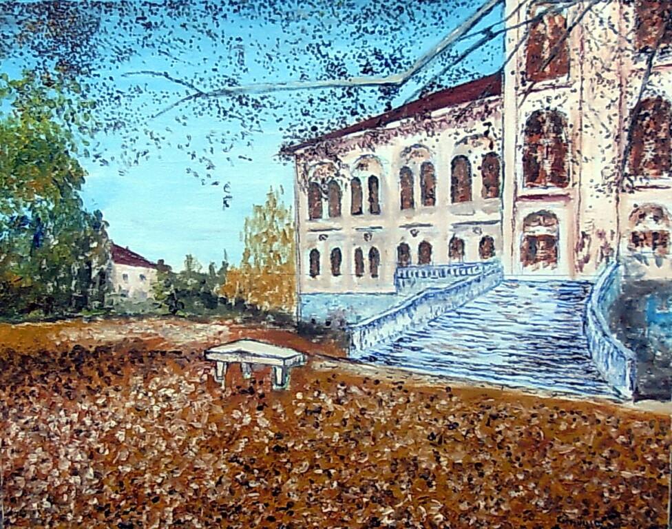 Predstavljam Vam svoju najnoviju sliku,ulje na platnu(50×40 cm), inspirisanu prelepim ambijentom Bukovičke banje u Aranđelovcu.U prvom planu,mirni park obasjan svetlošću vodi pogled ka delu čuvenog hotela Staro Zdanje,simbola elegancije i prošlih vremena.