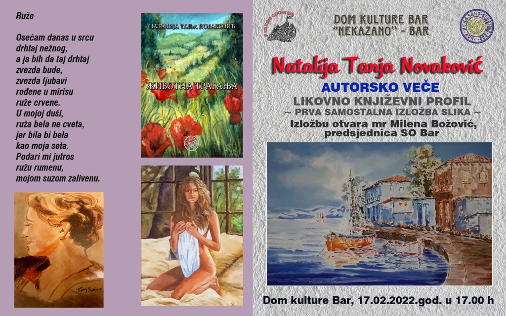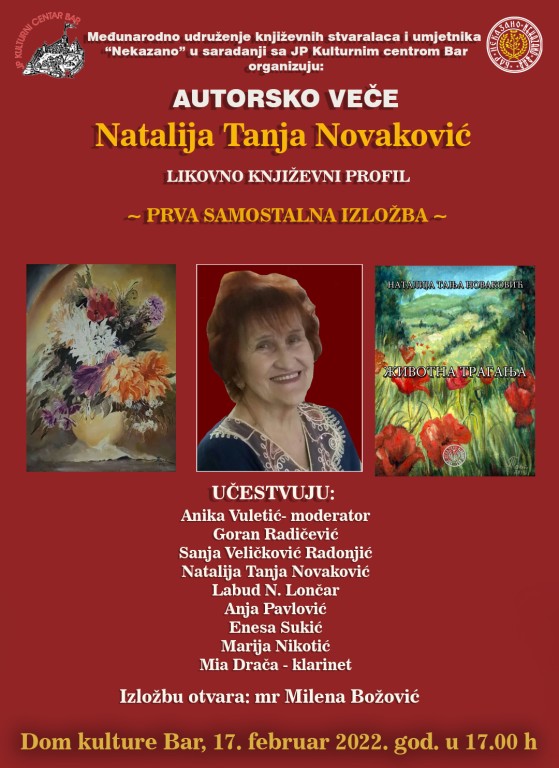 Međunarodno udruženje književnih stvaralaca i umjetnika „Nekazano“ i JP Kulturni centar Bar organizuju AUTORSKO VEČE Natalije Tanje Novaković, likovno – književni profil i PRVU SAMOSTALNU IZLOŽBU