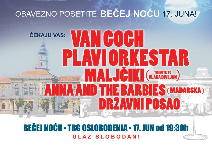 Plavi orkestar, Van Gogh, Anna & the Barbies, Maljčiki (tribute to Vlada Divljan) i ekipa Državnog posla učesnici su festivala „Bečej noću“ koji će biti održan u subotu, 17. juna, na Trgu oslobođenja u Bečeju. Koncert počinje od 19.30, a ulaz je slobodan!