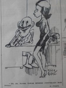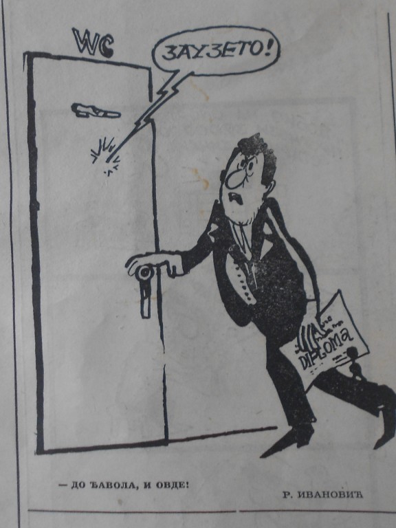 osvanjava, dosta pisanih (umo)tvorevina u kratkoj formi, što pisanih što ilustrovanih. Kad su ove druge u pitanju, opet posežemo za nekim graničnim područjem između karikature i kratkog stripa, koje bi bilo formalno prihvatljivo za našu tematiku. Pred nama su prizori iz jednog broja časopisa „Jež“, još iz 1969 (i to baš iz nekih dana kad se slave prvomajski praznici, sa sve prigodnim pošalicama!), koji je dakle izašao u sred nekog naizgled stabilizovanog perioda SFRJ , kad se možda živelo nešto lakše i svakako jednostavnije, hm? Ostavimo svako vreme sa njegovim prednostima i njegovim bremenom, a kod nas, rekosmo, ima na (ne)sreću dosta perioda koji pružaju obilje inspiracije za satirične teme!