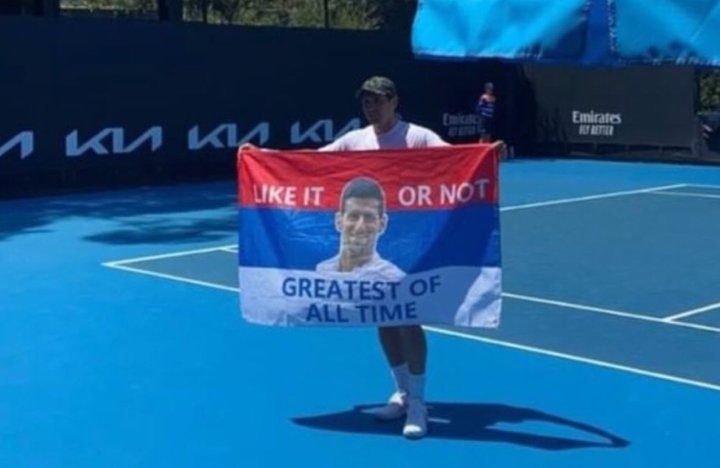 A onda je razvio srpsku trobojku sa likom Novaka Đokovića na kojoj na engleskom piše: