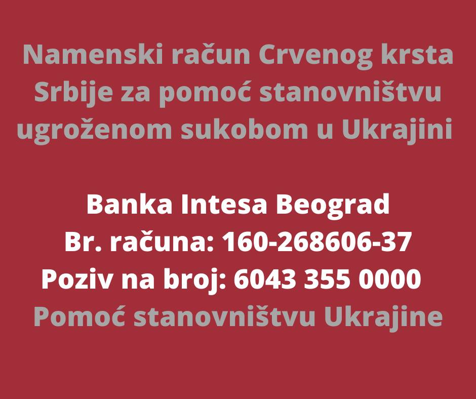Poštovani sugrađani, sva sredstva prikupljena na ovom računu biće upućena kao podrška Apelu za hitno delovanje Međunarodne federacija društava Crvenog krsta i Crvenog polumeseca za stanovništvo ugroženo sukobom u Ukrajini.