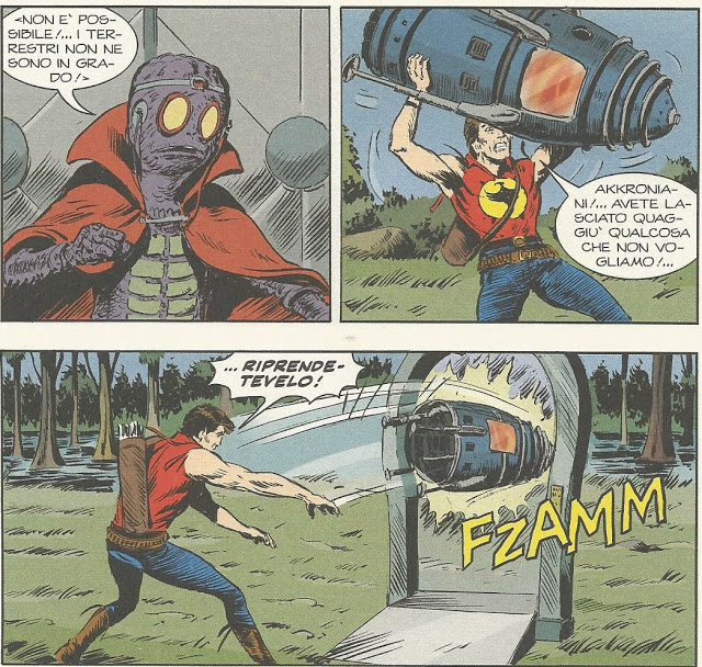 Akronjani iščekuju da im Zagor oda tajnu, jednostavnog a moćnog, oružja koje uspeva da ih ubije (da podsetimo, oni su u početku predstavljeni kao neranjivi, ali Zagor je već koristio mogućnost da im porastura makar uređaje i upravljače) – u pitanju je čudesna smeša planinskih minerala, a zahvaljujući tom principu funkcionišu i štitovi protiv njihovog oružja – svemirci jednostavno ne uspevaju da postignu te efekte, nakon što su se u svojim laboratorijama poslužili preciznim receptom koji su zadobili, pa čak ni pošto su potražili originalne sastojke u planinama Naatani u kojima su prvo i nađeni; stoga pitaju Zagora u čemu su pogrešili…Čak i Čiko, koji se baš ne proslavlja hrabrošću, moli Zagora da ne poklekne njihovim zahtevima i pretnjama! Zagor je otprilike shvatio, setivši se reči vrača Akota – Poenta je da nije dovoljno izraditi oružje po tačno zadatom receptu, važno je upotrebiti ga za pravu stvar!! („Oružje ništa ne znači bez ruke koja ga drži.“ A mi vidimo, dakle, da se to odnosi i na srce i dušu) Nakon što su ga na kratko (kako misle) Zagor se uverio da može da ubije Akronjanina i da efikasno upotrebi štit. U toj pometnji, naši junaci uspevaju da naprave lom među komandnim uređajima na brodu… izlaze… ali ostaje bomba koju su osvajači ostavili na području Darkvuda…