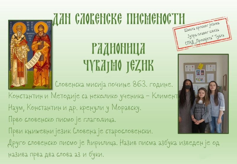 Polaznici Prosvjetine dopunske škole srpskog jezika „Jutra plavog sljeza“ u Tuzli održali su radionicu na temu „Čuvajmo jezik“, povodom 24. maja, praznika Svetih Ćirila i Metodija, Dana slovenske pismenosti.