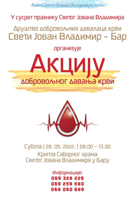 On je ispunio zapovijest Gospodnju da veće ljubavi nema od one da neko život svoj položi za bližnje svoje. Svoju ljubav prema Gospodu i prema bližnjima on je posvjedočio i zapečatio prolivanjem svoje mučeničke krvi. Zato nije čudo što je naš blaženopočivši Mitropolit Amfilohije, dajući blagoslov za osnivanje Društva dobrovoljnih davalaca krvi pri našem Sabornom hramu, odredio da ono ponese ime Sv. Jovana Vladimira.