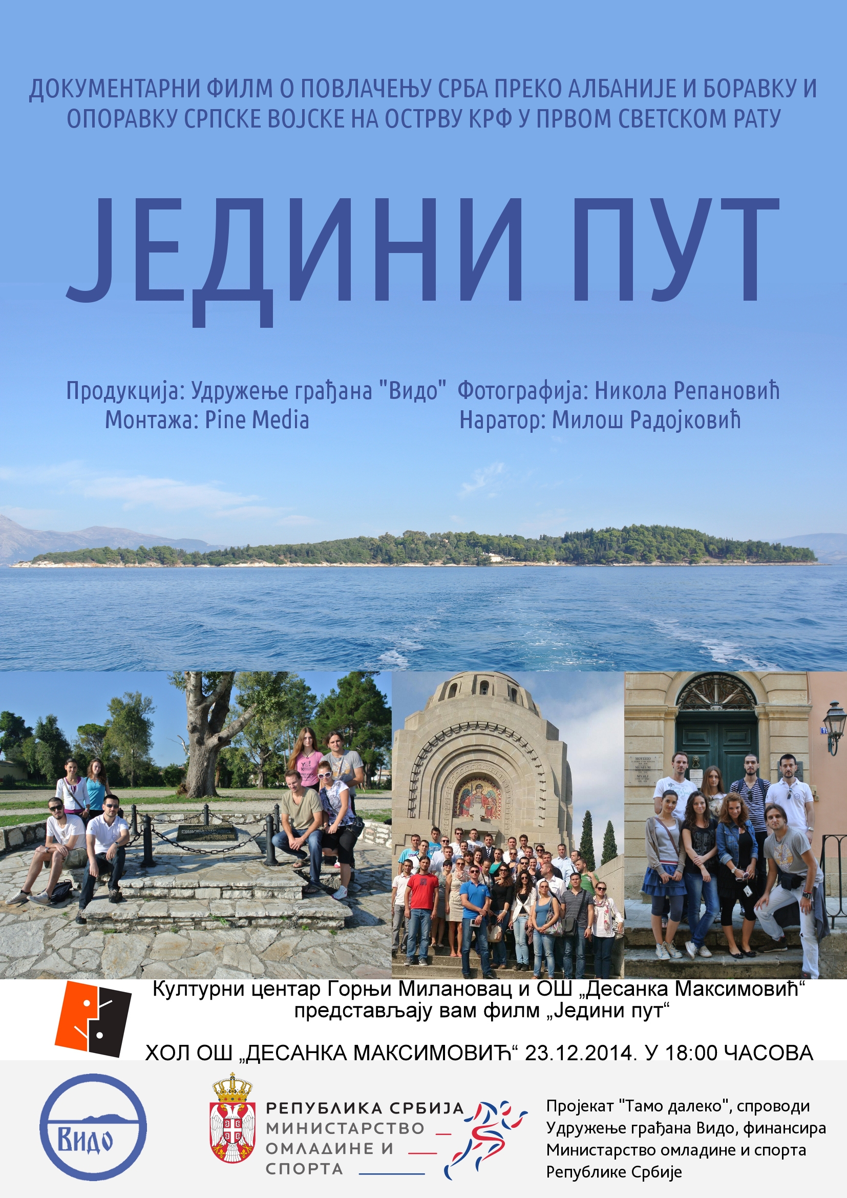 Udruženje građana “Vido” i Kulturni centar u utorak, 23.decembra u osnovnoj školi „Desanka Maksimović“ prikazaće film „Jedini put“. Reč je o dokumentarnom filmu koji govori o povlačenju Srba preko Albanije i boravku i oporavku srpske vojske na ostrvu Krf u Prvom svetskom ratu. Film predstavlja jedinstven omladinski poduhvat u načinu interpretacije bitnih istorijskih događaja u istoriji Srbije 20. veka.