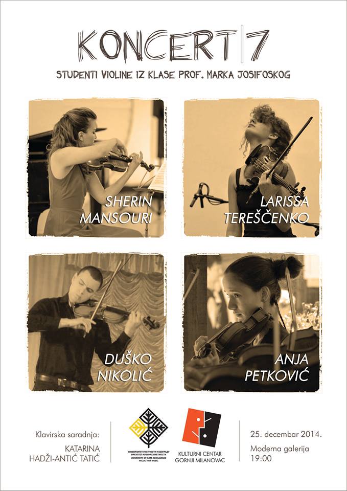 Studenti violine Fakulteta muzičke umetnosti u Beogradu iz klase prof. Marka Josifoskog, u četvrtak, 25. decembra održaće koncert u Modernoj galeriji.