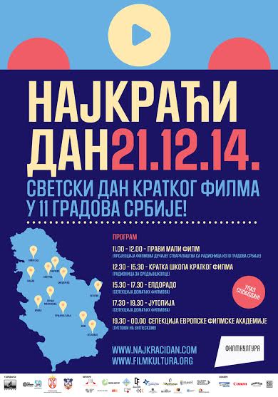 „Filmkultura“ u saradnji Evropskom filmskom akademijom organizuje manifestaciju „Najkraći dan“, filmski maraton revijalnog karaktera, koji će se održati 21. decembra u 11 gradova Srbije.