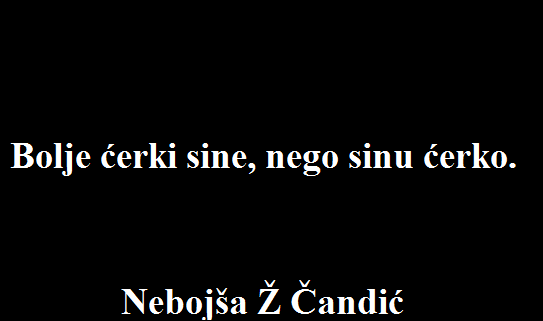 jan 29, 2018 Dnevna doza aforizma FacebookTwitterEmailViberReddItWhatsAppTelegramPrintPinterestTumblrLinkedinMixVKDiggLINENaver Facebook Prethodni tekstDa ne poveruješ: Fitnes trenerSledeći tekstNajmićniji evnuh Rimskog carstva Nebojša ČandićStudent iz Doboja, koji nije zapalio žito. Neko. Homo ludens. Uža specijalnost - igra riječima i kuvanje turske kafe u bosanskom loncu. Slobodnog vremena nema, jer ga provodi glumeći da je zauzet. PROČITAJTE! Knjige Petar Pismestrović: Partija pokera – knjiga karikatura Petar Pismestrović - dec 4, 2025 Satatatira Karikatura dana Petar Pismestrović - avg 13, 2025 Satatatira Karikatura dana Petar Pismestrović - avg 13, 2025 Otvorena vrata Jezičke nedoumice: Ujutro ili ujutru Zoran Todorović - feb 14, 2021 Satatatira Dnevna doza aforizma Mirjana Đapo - jan 16, 2018 Mesečina Nataša Stanić: Bolest neka umre Gospode Nataša Stanić - okt 31, 2016 Otvorena vrata Veće stipendije za niške najtalentovanije učenike i studente Zoran Todorović - jun 22, 2018 Otvorena vrata AIESEC Global Talent prakse Zoran Todorović - jun 8, 2018 Otvorena vrata Želite da uradite nešto dobro za svog mališana? Pustite ga da se dosađuje Zoran Todorović - jun 9, 2017 Zanimljivosti Za miran san i dobar dan: Ogi i bubašvabe (41) Đorđe Todorović - jul 8, 2017 Atelje Atelje Sabahudina Muranovića Murana Sabahudin Muranović-Muran - nov 29, 2018 Mesečina Neda Gavrić: Judin poljubac Neda Gavrić - okt 12, 2021 Otvorena vrata Likovni rad dana: Školarka Jovanka Ignjatović - avg 20, 2015 Zanimljivosti Misao dana Prvoslavka Marković - jan 9, 2017 Knjige Kuća maslina — Riznica kulture i duhovnog bogatstva Bara i Crne Gore Zoran Todorović - dec 8, 2024