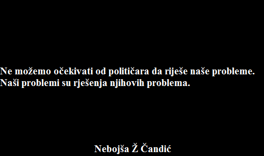 feb 5, 2018 Dnevna doza aforizma FacebookTwitterEmailViberReddItWhatsAppTelegramPrintPinterestTumblrLinkedinMixVKDiggLINENaver Facebook Prethodni tekstDa ne poveruješ: RukopisSledeći tekstLeskovčanin ima genijalan izum za pecanje ribe zimi, ali i za najbržu pripremu iste Nebojša ČandićStudent iz Doboja, koji nije zapalio žito. Neko. Homo ludens. Uža specijalnost - igra riječima i kuvanje turske kafe u bosanskom loncu. Slobodnog vremena nema, jer ga provodi glumeći da je zauzet. PROČITAJTE! Knjige Petar Pismestrović: Partija pokera – knjiga karikatura Petar Pismestrović - dec 4, 2025 Satatatira Karikatura dana Petar Pismestrović - avg 13, 2025 Satatatira Karikatura dana Petar Pismestrović - avg 13, 2025 Fotografija Fotografija dana Sandro Puncet - okt 1, 2022 Kultura Žička hrisovulja dodeljena pesniku Radu Tanasijeviću Zoran Todorović - avg 20, 2022 Magazin Beogradska Azbuka – Slovo J – Jevremovac (Botanička bašta) Miroslav Lj. Ranković - jun 22, 2016 Otvorena vrata Uručene nacionalne stipendije konkursa „Za žene u nauci“ Jovanka Ignjatović - okt 10, 2014 Kultura 3. Pozorišni FESTIVAL POBEDNIKA FESTIVALA, Rakovica 2017: najava i program Marko Radojičić - okt 6, 2017 Knjige Drama “Prokletstvo“ KULTURNI CENTAR GORNjI MILANOVAC - maj 21, 2015 Strip Nekih 196 strana iz franko-belgijske kuhinje (2) Mišo Koprivica - jan 29, 2019 Otvorena vrata Sveska: Stefanovo drvo Jovanka Ignjatović - maj 12, 2015 Mesečina Ne volim rijeke – Dajana Aleksić Dajana Aleksić - dec 22, 2016 Satatatira Oj svijetla majska zoro Deana Sailović - dec 17, 2016 Fotografija Arsenal fest 2023 – Parov Stelar Miloš Ignjatović - jul 3, 2023 Zanimljivosti Za miran san i dobar dan: Marsupilami 9. epizoda Đorđe Todorović - avg 24, 2016