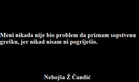 feb 12, 2018 Dnevna doza aforizma FacebookTwitterEmailViberReddItWhatsAppTelegramPrintPinterestTumblrLinkedinMixVKDiggLINENaver Facebook Prethodni tekstDa ne poveruješ: Crvena kosa i plave očiSledeći tekstLjubavna priča Desanke Maksimović: Bio je njena prva i jedina ljubav Nebojša ČandićStudent iz Doboja, koji nije zapalio žito. Neko. Homo ludens. Uža specijalnost - igra riječima i kuvanje turske kafe u bosanskom loncu. Slobodnog vremena nema, jer ga provodi glumeći da je zauzet. PROČITAJTE! Knjige Petar Pismestrović: Partija pokera – knjiga karikatura Petar Pismestrović - dec 4, 2025 Satatatira Karikatura dana Petar Pismestrović - avg 13, 2025 Satatatira Karikatura dana Petar Pismestrović - avg 13, 2025 Vesti Francuska savladala Norvešku za drugo zlato na SP! Zoran Todorović - dec 17, 2017 Otvorena vrata Likovni rad dana: Moji inicijali Jovanka Ignjatović - dec 17, 2016 Satatatira Epigram: Zalud… Nenad Živković - okt 18, 2016 Strip Internacio-naši 09: Alisa s onu stranu Holivuda (Distorted Mirror) Ivan Veljković - jun 19, 2016 Strip Dva duga povratka kući…Grafička novela „Prozor“ Srboljuba Nikića i Gorana Trajkovića Zoran Todorović - avg 24, 2017 Magazin Zakotrljaj me oko sveta: Batumi Mihailo Todorović - nov 11, 2018 Strip Hogar strašni – 50 godina strrraha i smeha! Mišo Koprivica - feb 5, 2023 Knjige „Nekazano“ časopis za kulturu i umjetnost – Konkurs Zoran Todorović - mar 23, 2025 Magazin Mariana Qunbar (Selma Selma) – Srećan prvi dan škole Mariana Qunbar - sep 2, 2019 Magazin Poezija je ponovo u modi: Kamena kuća sa plavim prozorima Zorica Tijanić - avg 29, 2017 Magazin Zakotrljaj me oko sveta: Meandriranje između Slovačke i Poljske Zoran Todorović - feb 17, 2018 Mesečina ATELJE: beli bagrem, akril na platnu, (30X30) Jasmina Perović - jan 15, 2015