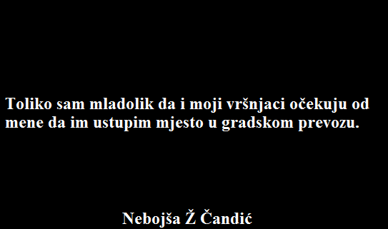 feb 26, 2018 Dnevna doza aforizma FacebookTwitterEmailViberReddItWhatsAppTelegramPrintPinterestTumblrLinkedinMixVKDiggLINENaver Facebook Prethodni tekstDa ne poveruješ: Od idiota do slavnog piscaSledeći tekstUžičanin koji je dospeo u Ginisovu knjigu: Upisao fakultet u 69. godini Nebojša ČandićStudent iz Doboja, koji nije zapalio žito. Neko. Homo ludens. Uža specijalnost - igra riječima i kuvanje turske kafe u bosanskom loncu. Slobodnog vremena nema, jer ga provodi glumeći da je zauzet. PROČITAJTE! Satatatira Karikatura dana Petar Pismestrović - dec 6, 2025 Knjige Petar Pismestrović: Partija pokera – knjiga karikatura Petar Pismestrović - dec 4, 2025 Satatatira Karikatura dana Petar Pismestrović - avg 13, 2025 Magazin Reciklaža je i… Nada Kljajić - sep 20, 2015 Zanimljivosti Misao dana Prvoslavka Marković - mar 30, 2017 Atelje Atelje Zorana Žugića Zoran Žugić - jan 4, 2019 Satatatira COOLumna Deana Sailović Deana Sailović - feb 19, 2016 Magazin žika ranković: v e r a Žika Ranković - nov 13, 2015 Otvorena vrata Likovni rad dana: Jesen Jovanka Ignjatović - nov 9, 2016 Mesečina Sanja Trninić – Kuća na jezeru Sanja Trninić - dec 2, 2018 Zanimljivosti Mozgalica nedelje (br. 93): Izdajnik Zoran Todorović - maj 8, 2016 Muzika Moji drugari_cover by mmcela Miša mmcela Acoustic - dec 14, 2018 Kultura Endi Vorhol i rokenrol Uroš Timić - sep 16, 2016 Mesečina I u vatru i u vodu Zoran Todorović - mar 24, 2014 Priključenija Odbojka: Spartak ubedljiv u Inđiji Uroš Selenić - nov 22, 2015