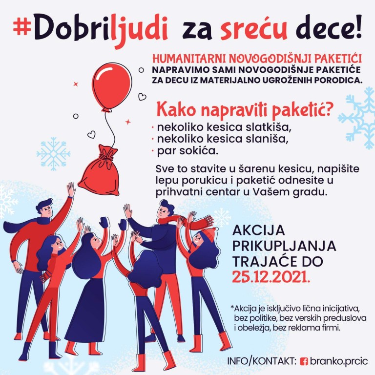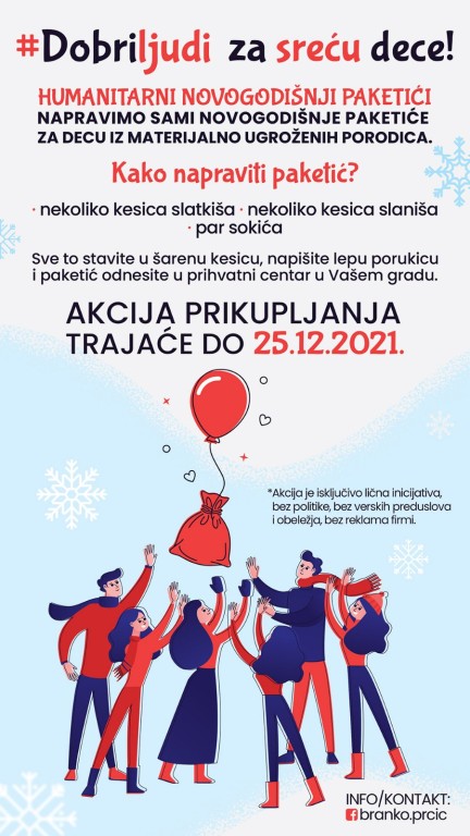 Okupljeni oko ideje da predstojeće praznike ulepšaju deci iz materijalno ugroženih porodica, grupa dobrih ljudi prošle godine je na društvenim mrežama, pokrenula humanitarnu akciju prikupljanja novogodišnjih paketića u kojoj je sakupljeno 4 837 paketića za decu iz 2047 porodica. Ove godine, akciji koja traje do subote, 25. decembra, pridružilo se skoro 20 gradova. Prihvatni centri otvoreni su u Subotici, Novom Sadu, Zrenjaninu, Vršcu, Inđiji, Rumi, Bačkoj Topoli, selu Đala, Nišu, Ćupriji, Kragujevcu, Kruševcu, Šapcu, Smederevu, Beogradu i Vranju.