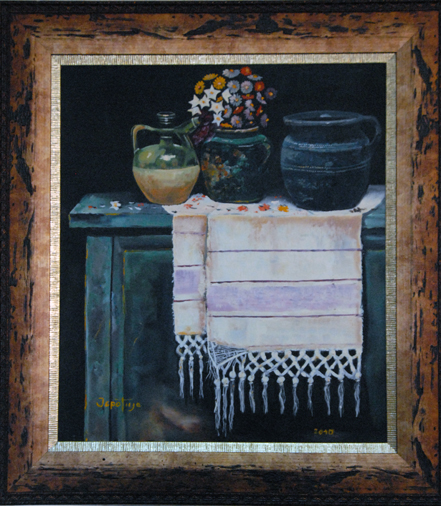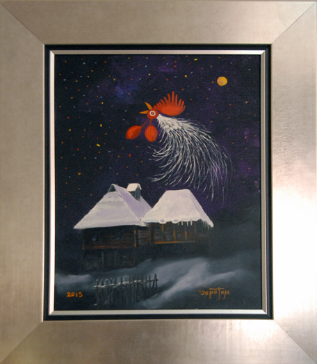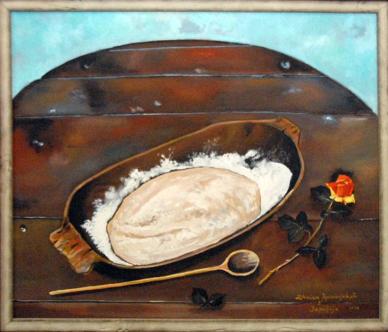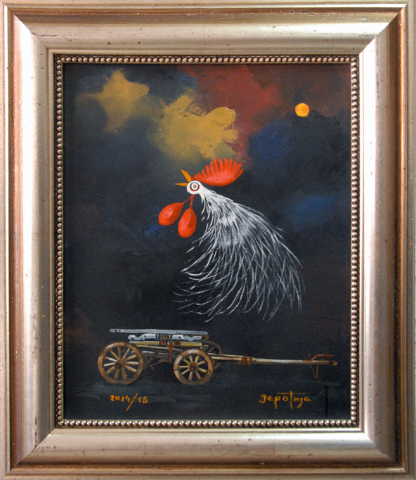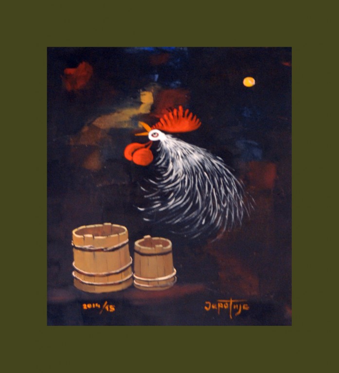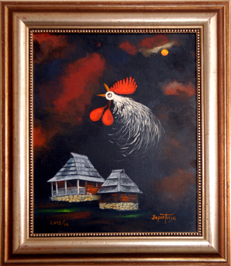 Један део мотива узет је из гружанског краја пре свега из села, некадашњег средњевековног града, Борач. Јеротије је монах културе, који посвећено и предато осликава пре свега оно што би могли изгубити. Доминира Јеротијев „Будилни глас са Голога брда” слике петла из циклуса „Буђење Србије”. Његов петао је загледан у Сунце, а иза леђа му је увек месец који симболизује лунарну наду нашег човека да после просветљења дође до задовољства кроз лепо. Свака каснија слика добија детаље наше градиниране орнаментике, историје, уметности, религије и предметности што се све обједињава у културну баштину. У другом делу ових слика су детаљи, почев од  предмета обично оних који нису у употреби, старе куће попут оне у Вучетићима из села Борач.   Пажњу привлаче и слике са Борачког крша. Оне симболизују камену плодност, вечну стражару на овој ватрометини где су српске и османлиске војске оставиле никад сасвим избројане кости. „Мистичне стене Борачког крша” је књига у камену, како каже песник Душан Божовић, су пред нашим сликаром отвориле душу. Оснивни мотив ликовне поставке су сеоске куће. Кућа као једна од најтемељнијих речи српског језика синоним је и симбол људског живота; родног огњишта, породице, завичаја, али и сувог цвећа окаченог у  млекару. Изнео је пред нас чувене ћилиме, качице за кајмак, шавољ, хлебник… пробудио у нама носталгију. Овим сликама Јеротије опомиње.  Модерни свет је суров. Све је то отргнуо сликар од „заборава”. Ликовна дела Драгана Јеротијевића греју нашу душу, он је чувар традиције, али и стваралац новиг самосвојног ликовног израза , рекао је приликом отварања ликовни критичар Милијан Деспотовић.