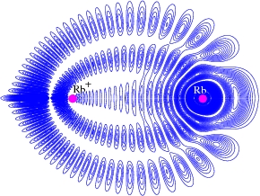 b) Drugu klasu ovog molekula obrazuju neutralni atom Rb i pobuđeni atom Rb sa degenerisanim angularnim momentom (l>2) i glavnim kvantnim brojem n=30. Rastojanje između dva Rb atoma u ovom stanju je oko 600 angstrema. Manje rastojanje govori da je veza između atoma jača.