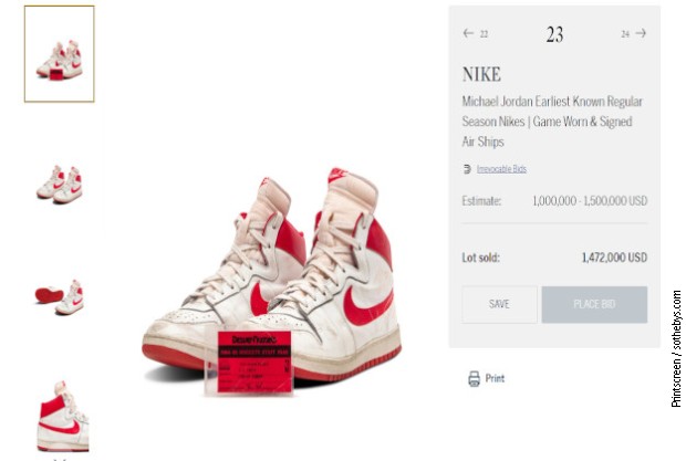 Na aukciji su prodate prve patike Majkla Džordana koje su postale poznate u javnosti, a koje je nosio na petoj NBA utakmici, u početničkoj sezoni 1984. godine, piše Blumberg i podseća da su te godine kompanija „Najki“ i Džordan kreirali prepoznatljivu liniju obuće i odeće sa njegovim imenom.