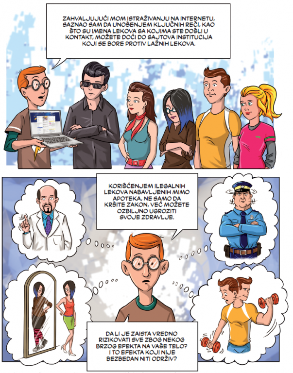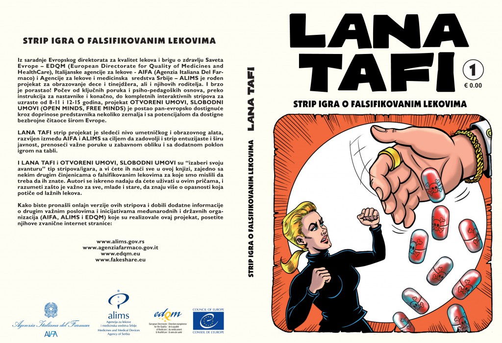 Lana Tafi – edukacija mladih o falsifikovanim lekovima i predstavljanje istoimenog edukativnog stripa Opasnost od falsifikovanih lekova po ljudski život je ogromna, od čega nije zaštićena nijedna zemlja, pa ni naša. Takođe, nažalost, ova pojava sve više utiče i na mlade. Oni u kontakt sa ovim proizvodima dolaze preko Interneta i društvenih mreža, koristeći ih uglavnom u rekreativne svrhe, ali nesvesni da time ozbiljno i dugoročno ugrožavaju svoje zdravlje. Unapređenje znanja o falsifikovanim lekovima je ključno za očuvanje zdravlja i života mladih ljudi. Kako bi se deci, tinejdžerima i studentima pojasnila ova tema na pristupačan i zanimljiv način, napravljen je edukativan strip „Lana Tafi“ u formi interaktivne igre – priče sa više krajeva. Čitaoci ovog stripa imaju aktivnu ulogu, i svojim odlukama vode kroz priču likove sa kojima se lako mogu identifikovati, pokušavajući da izbegnu zamke i iskušenja nalik onima koje ih mogu snaći u stvarnom svetu. Ovaj projekat je okupio referentne državne i međunarodne institucije u Evropi i Srbiji koji se bore protiv falsifikovanih lekova, konkretno Evropski direktorat za kvalitet lekova i brigu o zdravlju Saveta Evrope (European Directorate for Quality of Medicine and Healthcare – EDQM of Council of Europe) i Italijansku agenciju za lekove (Agenzia Italiana del Farmaco – AIFA) koji su finansirali projekat, dok je za realizaciju bila zadužena Agencija za lekove i medicinska sredstva Srbije – ALIMS. Ozbiljna naučna podloga ključnih poruka i metoda upotrebe „Lane Tafi“ od strane edukatora je obezbeđena od naučnika – psihologa sa Univerziteta „La Sapienza“ u Rimu i Univerziteta u Veneciji, dok je implementacija najboljih praksi u borbi protiv falisfikovanih lekova uneta od strane eksperata AIFA i ALIMS. Na samom stripu su radili Mr.farm. Pavle Zelić iz ALIMS koji je pored pisanja scenaria bio i vođa projekta, i Boris Nenezić, diplomac Akademije primenjenih umetnosti Univeziteta u Beogradu i uspešan ilutrator i strip autor, dok je koncept definisao Dr Domeniko Di Đorđo iz AIFA. Zato je, pored obrazovne uloge, „Lana Tafi“ realizovan sa puno umeća i kreativnosti, i u duhu devete umetnosti – stripa. Cilj ovog projekta je da se poruka i znanje o problemu falsifikovanih lekova prenese što većem broju mladih ljudi. Veliko interesovanje preko 10 država, članica Saveta Evrope, od Jermenije do Velike Britanije i od Malte do Poljske, koje su najavile da će objaviti ovaj strip i koristiti ga za edukaciju mladih u svojim zemljama je najveća potvrda uspeha i relevantnosti ove velike inicijative. Na prvoj tribini u Studentskom kulturnom centru Beograd održanoj 28.09.2015. je pred preko 300 đaka i studenata promovisan ovaj projekat, a svi prisutni su dobili na poklon primerak stripa. I na budućim promocijama na kojima će se deliti stripovi i koje će se održavati u školama, na fakultetima, u udruženjima, i skupovima je planirano da se pojasni tema falsifikovanih lekova u širem kontekstu, ali i detaljno predstavi projekat „Lana Tafi“, kako bi učesnici tih predavanja tu poruku preneli što dalje i šire i samim tim sačuvali svoje zdravlje, kao i zdravlje svojih vršnjaka i naravno, uživali u avanturama Lane Tafi!