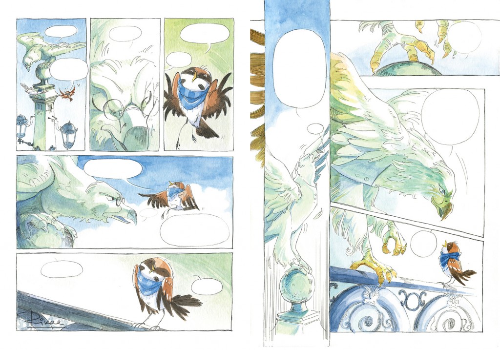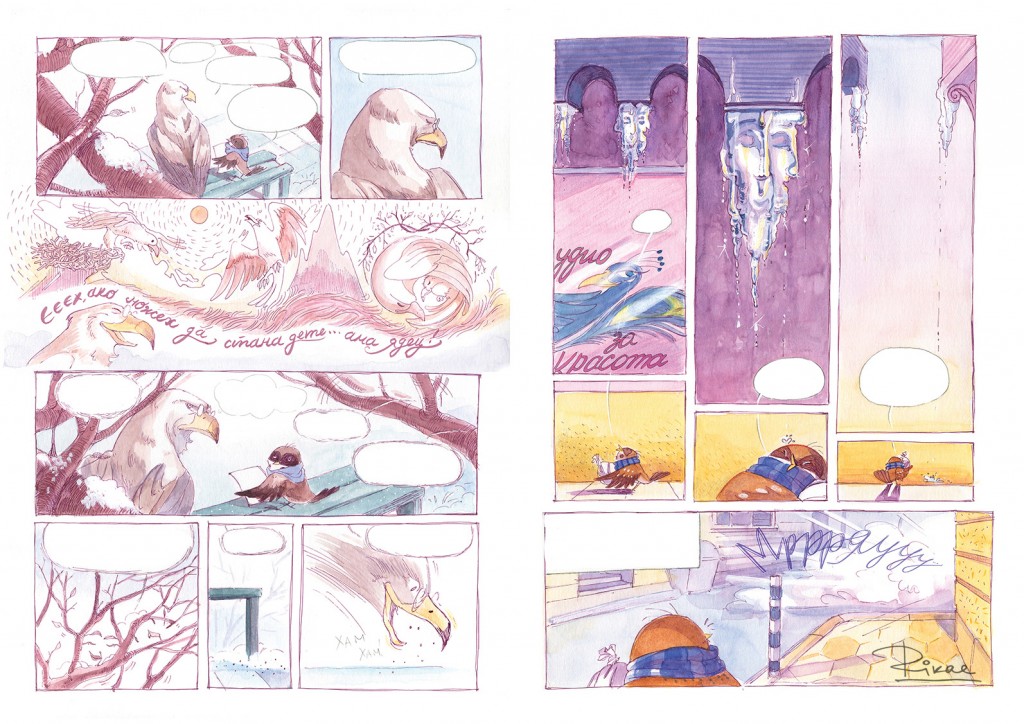 Valjalo bi pomenuti crtež, a za ovakvo delo samo jedna autorka je mogla da se uklopi. Što bi naš strip autor Geza Šetet rekao, a što ovde parafraziram, mogla je samo ona i niko drugi. Ana Cočeva je čitaocima na Tapas-u poznata kao Rikae, sa bezmalo pet „serijala“ uredno postavljenih i sa hiljadama pregleda. Ljudima kojima je potreban stručnjak za crtanje će biti pravo malo otkrovenje, s obzirom da je svoje veštine oštrila na najboljim akademijama u Španiji, Velikoj Britaniji i Estoniji (kao i u rodnoj Bugarskoj). Polaznici „Manga akademije“ u Sofiji je znaju kao predanog predavača sa izvanrednom radnom etikom. Čak je i srpska plejada strip autora, starih koliko i novih, imala prilike da je upozna u Leskovcu, na Balkanskoj smotri mladih strip autora. Igrom slučaja, tu sam uspeo i da nabavim svoj primerak „Orla, vrapca i kapljica“ sa sve posvetom, kao i da razmenim jedva dve rečenice s autorkom (naposletku, morala je da putuje ranije natrag).