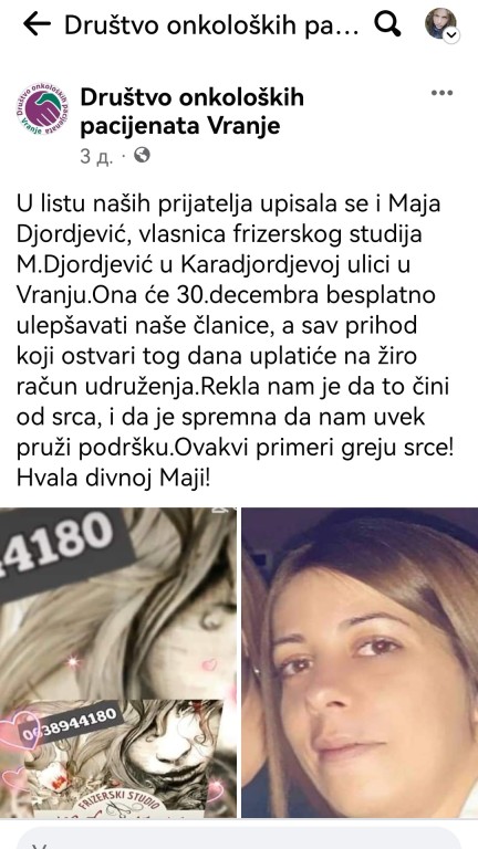 Srca onkoloških pacijenata u Vranju pred doček Nove godine dodatno je ugrejala Maja Đorđević, vlasnica frizerskog salona u Karađorđevoj ulici.