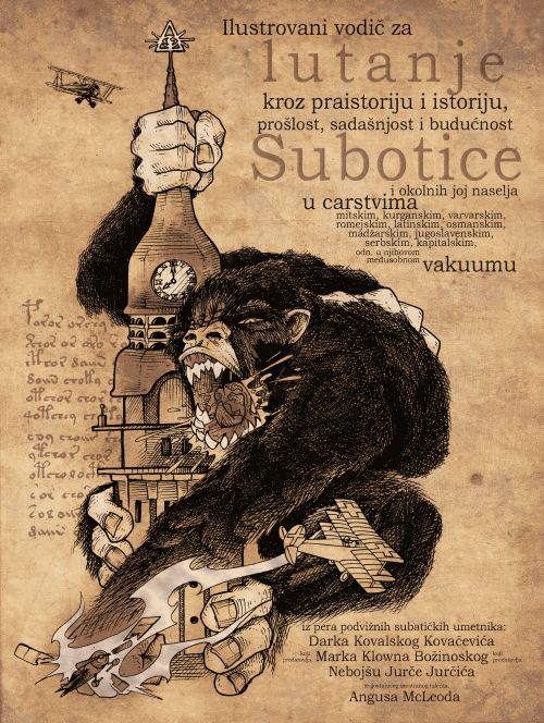 Za početak, valjalo bi citirati neobično kratak naslov ovog dela. A to je „Ilustrovani vodič za lutanja kroz praistoriju i istoriju, prošlost, sadašnjost i budućnost Subotice i okolnih joj nasilja u carstvima mitskim, kurganskim, varvarskim, romejskim, latinskim, osmanskim, madžarskim, jugoslavenskim, serbskim, kapitalskim, odnosno u njihovom međusobnom vakuumu“. Toliko me je raznežio ovaj sitni naslov da ću, onako zarad njega i moje dobre volje, da ga kroz ovaj tekst copy/paste-ujem, čisto da se oseti važnim. Još je interesantnije ime autora. AutorA, množina. To su, (ne)redom, Darko Kowalsky Kovačević, Marko Klown Božinoski, Nebojša Jurča Jurčić i gost iz Kanade Angus Meklaud.