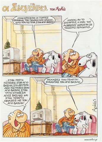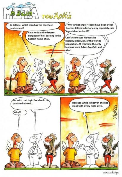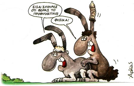 Nastavljamo sa predstavljanjem grčkog doprinosa devetoj umetnosti! U suštini, želja nam je da ove prikaze začinimo sa nekoliko komičnih, opuštajućih priloga… A faktor, tj. umetnik koji nam sad nudi glavne adute za to poznat je po stvaralačkom imenu Arkas. A pravo ime? Ee… za širu javnost ono za sada ostaje negde u senci, a možda nam i nije toliko bitno, dokle god se kreiraju i prosleđuju ovi zabavni prilozi! Naravno, ne bismo ni da se bavimo spekulacijama o identitetu tajanstvenog autora; inače. kao što se vidi, poznat je po brojnim kratkim zgodama o životinjama (ponekad i karikatura u jednom kadru), pri čemu je dosta zastupljeno neobično nadahnuće u vezi sa njihovom seksualnošću, a obrađuju se naravno i odnosi nekih od njih sa ljudima.