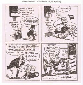 ostareli trkaći konj, da kažemo i simpatična raga, po imenu „Spark Plug“) po imenu Spark Plug (u automobilskoj tehnici to bi bila ‚svećica‘!). Ovaj konjić, obično prikazan sa zaštitnim ogrtačem, idejno i marketinški bio toliko zapažen da su mu u kasnijim prikazima posvećenim stripovima neki prosto tepali i Snupi 1920-ih. Bitni momenti nastaju 1934. kada Barni sreće Snafija Smita (Snuffy Smith), seljaka iz planina Severne Karoline, koji je vremenom postao i dominantan lik, sa svojom porodicom, dok Barni, gubeći manje ili više na značaju, jedno vreme uopšte ne figurira u ovom stripu! Ako je bitno, zapažamo da ga Snafijeva supruga Luizi uveliko prevazilazi svog muža po dimenzijama, ali iz nama dostupnih primera nema indicija da neguje držanje zbog kojeg bi njen životni saputnik cvikao i osećao se ugroženim.