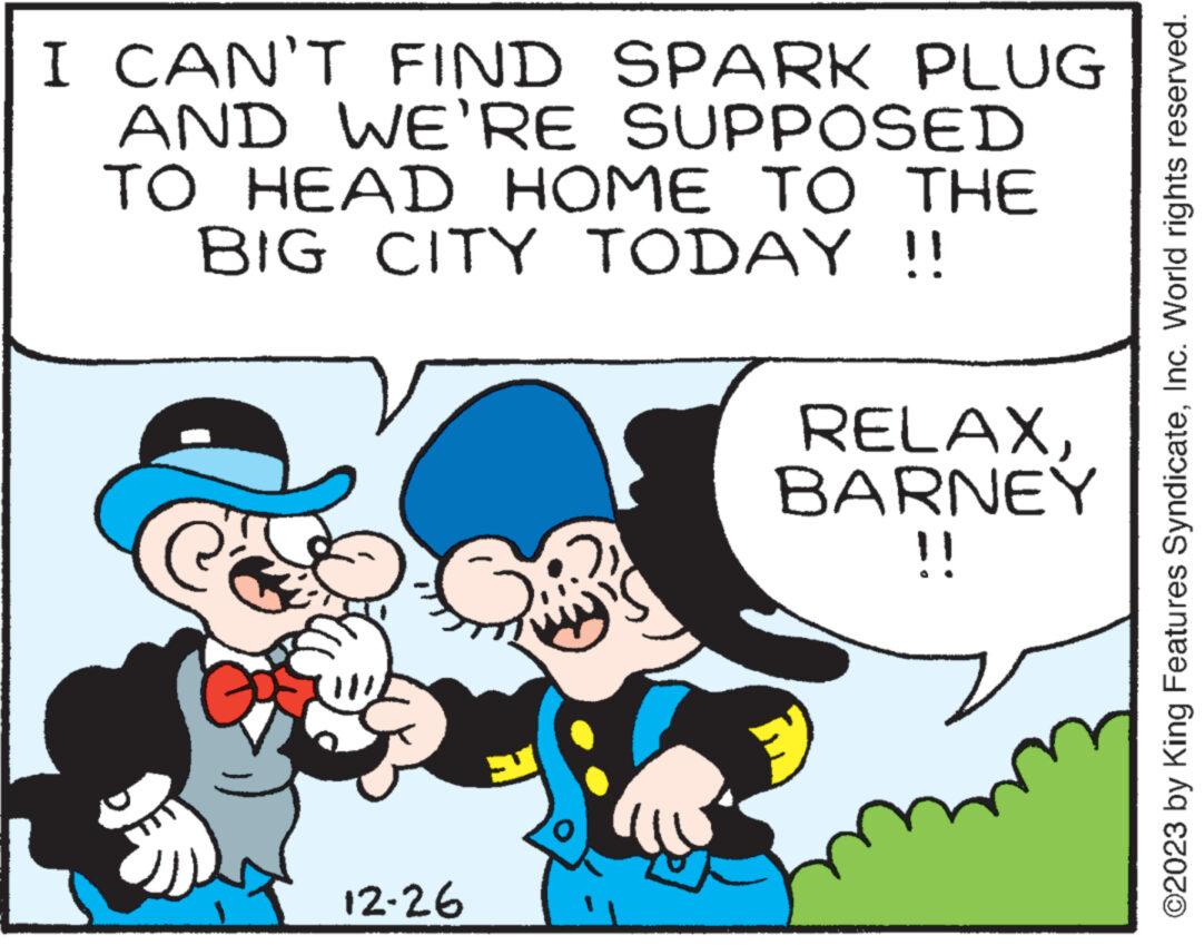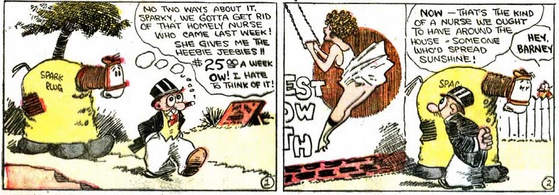 ostareli trkaći konj, da kažemo i simpatična raga, po imenu „Spark Plug“) po imenu Spark Plug (u automobilskoj tehnici to bi bila ‚svećica‘!). Ovaj konjić, obično prikazan sa zaštitnim ogrtačem, idejno i marketinški bio toliko zapažen da su mu u kasnijim prikazima posvećenim stripovima neki prosto tepali i Snupi 1920-ih. Bitni momenti nastaju 1934. kada Barni sreće Snafija Smita (Snuffy Smith), seljaka iz planina Severne Karoline, koji je vremenom postao i dominantan lik, sa svojom porodicom, dok Barni, gubeći manje ili više na značaju, jedno vreme uopšte ne figurira u ovom stripu! Ako je bitno, zapažamo da ga Snafijeva supruga Luizi uveliko prevazilazi svog muža po dimenzijama, ali iz nama dostupnih primera nema indicija da neguje držanje zbog kojeg bi njen životni saputnik cvikao i osećao se ugroženim.