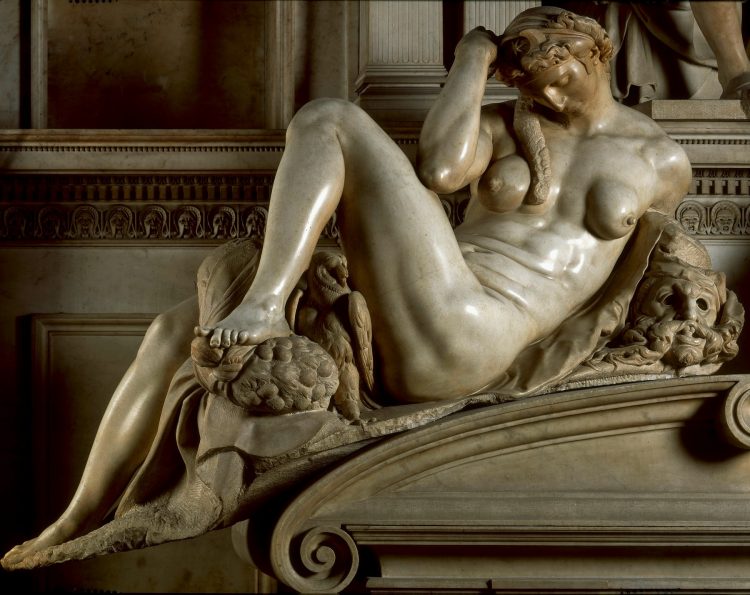 Nalakćena, u istoj pozi kao i Mikelanđelove alegorijske skulpture Zore i Sutona iznad nje, da bi dosegla mračno udubljenje između zida kapele i sarkofaga, ona je ukazala na prljav crni kvadrat, ostatak dokaza kako je nekada izgledao mermer, pre čišćenja.