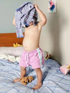 Deca posmatrajući odrasle usvajaju određene modele ponašanja i to prenose u svoju imitativnu igru. Kada je oblačenje u pitanju, često se dešava da deca obuku garderobu svojih roditelja, imitirajući odrasle. Pedagozi savetuju da bi rotitelji trebalo što ranije da počnu da uče svoju decu da se sama oblače. Time se ne vrši nikakav pritisak, jer i sama deca žele da pokažu svoju nezavsnost od roditelja.