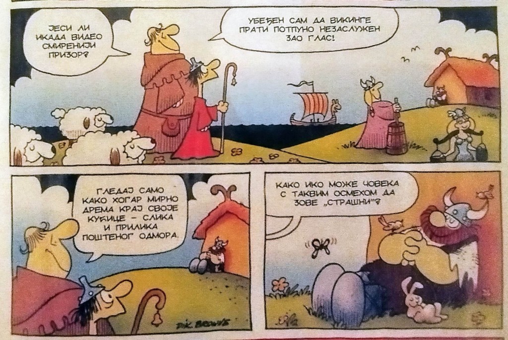 Ovu stranicu (nije prvi put) posvećujemo jednom od najpoznatijih, a nekako inajsimpatičnijih, varvarskih vođa iz sveta stripa, a svakako najpoznatijem stripovskom vikingu – Hogaru Strašnom!!! (engl. Hägar the Horrible) Nema potrebe da sad razmatramo taj interesantni sklop Hogarovih osobina niti njegovu porodičnu situaciju, jer ga jako dobro znamo kao odlučnog i nezaustavljivog vođu pljačkaškog pohoda, a s druge strane kao brižnog i nežnog oca i supruga, pritom ponekad nesnalažljivog i detinjastog, u nekim prilikama vidno priprostog… Nema potrerbe ni da čeprkamo po istorijskom i geografskom kontekstu u kome se odvijaju zbivanja sa našim junacima, ali činjenica je da ovaj strip pokriva mnoge porodične, druževne i ostale zgode iz svakodnevnice (i iz avantura, naravno) koje nose neki univerzalni značaj i za savremenog čitaoca, što svakako nosi deo tih neodoljivih čari čitanja ovog ostvarenja.