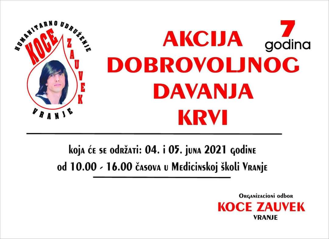 Poštovani članovi HU Koce Zauvek organizuje svoju tradicionalnu akciju dobrovoljnog davanja krvi dana 04. i 05. juna u vremenu od 10.00 do 16.00 časova u Medicinskoj školi „Dr Izabel Emsli Haton“ u Vranju uz primenu svih epidemioloških mera u saradnji sa Crvenim krstom Vranje. Pozivamo sve humane ljude da podrže akciju.