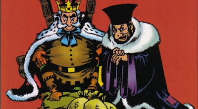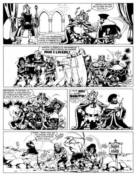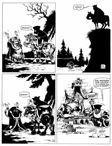 poznatijeg Alan Forda... Naslov ovog priloga dovoljno podseća na naziv prve dugometražne epizode, „I bio jednom jedan kralj“. (ital. C’ era una volta un re – malo kasnije ćemo o strukturi samih izdanja) U pitanju je retko kvalitetan primer stripa sa tematikom iz onog klasičnog, mračnog Srednjeg veka koji je na ovako naglašen način (malo groteskno, ali sa ozbiljno razrađenim zapletima!) protkan izražajnim crnim humorom! Zamislite ako postoji čak i porez na siromaštvo, i ako sa čuđenjem i prezirom ustanove da neko od podanika nije u stanju da to isplati, te mu sledi drakonska kazna…..!! Pa onda i predstavnici naroda koji u želji da izraze negodovanje, jednostavno nastoje da što učtivije i obazrivije pristupe sa svojim zahtevima, sa tvrdnjom da narodu treba samo hleba i rada – na to kralj jednostavno odgovara da je običaj da se zahtevima udovoljava sa nekih 50% – dakle, hleba ne, a rada odmah!
